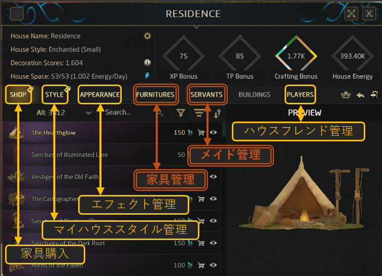最初に触るであろう箇所は茶色の家具管理(設置)、メイド管理(雇用)だと思います。