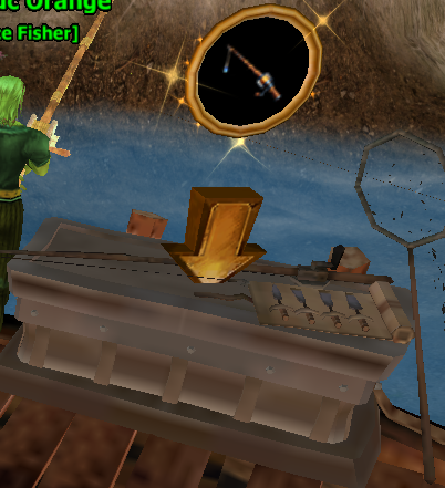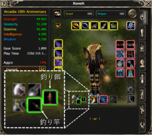 ![]() | キャラクタウインドウ内の釣り竿をアクションバーにセット、 ショートカットを押すと釣りが開始される |