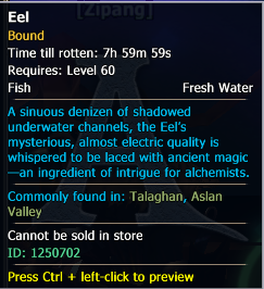 | レベル上げ② | アスランバレー (Aslan Valley) | Barracuda、Eel | 「Stream Zone」はさほど多くないが、 レベルが低くても高く売れる Barracuda が釣れる。 Eelは安い上、レベルが60になるまで釣れないが、料理や錬金などの素材として使う。 |