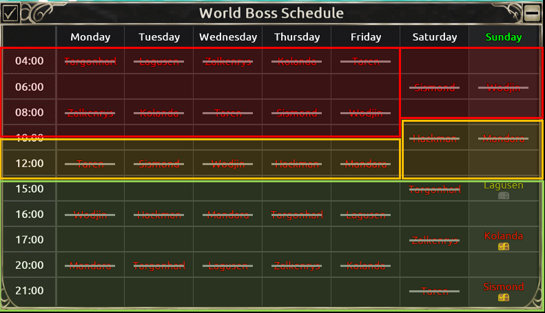 | 緑 | 人数が揃いやすく安定して討伐できる時間帯です。(ボスの強さにより失敗することもあります) |