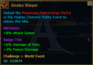 | Snake Slayer (532074) | The Hydra Charmer 初回クリア | +8% 物理攻撃スピード | +6% ドットダメージ +3% 毒ダメージ |