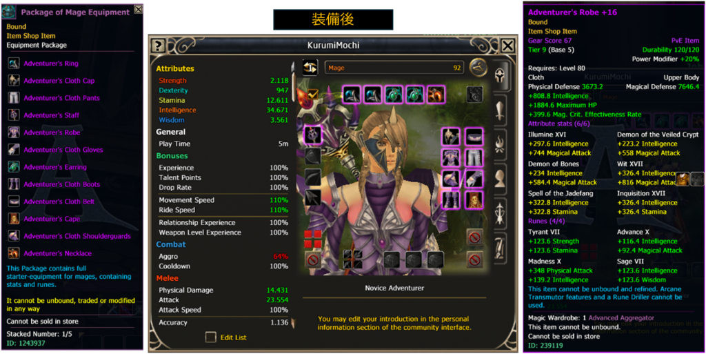 再度話しかけ、1つ目(現在のクラスの装備をください)を選択すると以下のような装備貰えます。