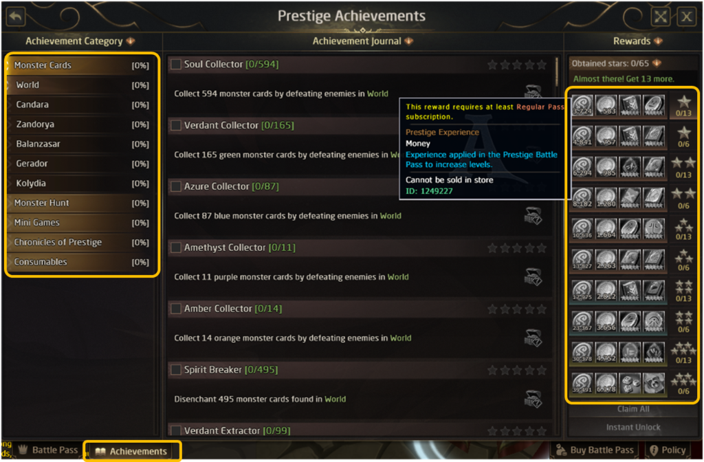 Achievements(実績)をたまに確認し、それぞれのカテゴリをに「!」が付いていないかを確認してください。