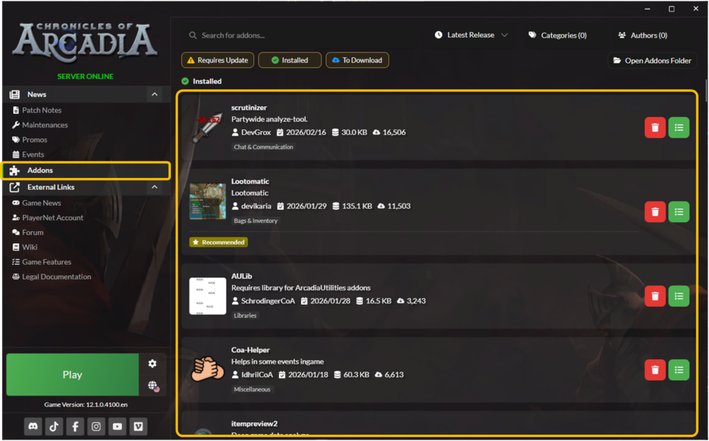 アドオンは基本ゲームランチャからインストール、アップデートします。