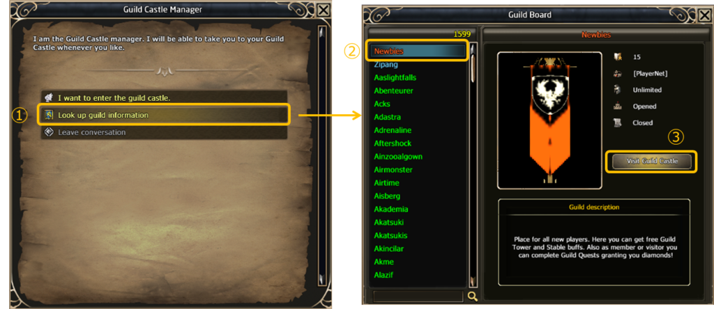 初心者限定クエストは、Newbiesギルドキャッスル内のクエスト掲示板から