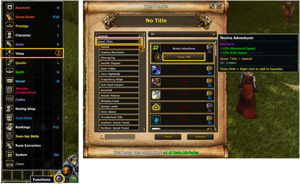 ゲームを始めるとRoM同様すぐに「Novice Adventurer」の称号が貰えます。