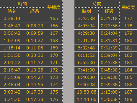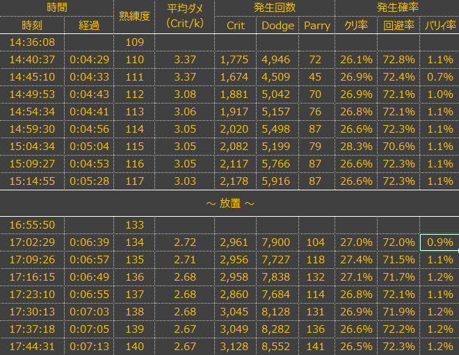 開始時点での防御熟練はLv90、記録を取り始めたのが109からでした。